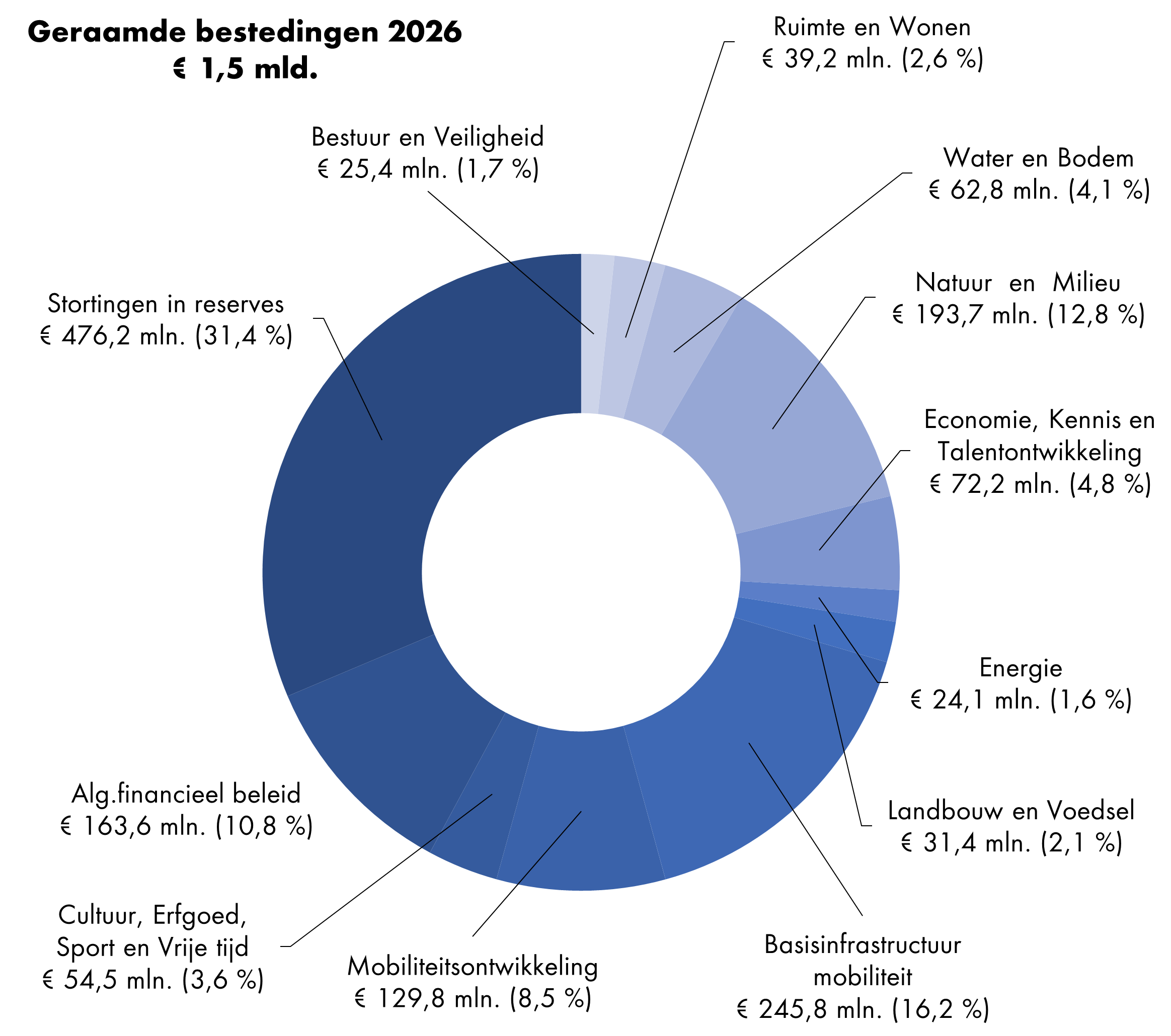 Terug naar navigatie - - Financiële positieDe financiële positie van onze provincie is stabiel en gezond. Onze meerjarenbegroting is structureel in evenwicht en onze structurele inkomsten zijn – ook meerjarig – groter dan de structurele lasten. De reservepositie is daarbij goed te noemen. We beschikken over een immunisatieportefeuille die we inzetten om revolverend te investeren in het realiseren van onze ambities. We hebben voor ca. € 1,5 mld. aan beleidsreserves die in ieder geval voldoende zijn om onze beleidsambities voor de komende jaren te realiseren en onze financiële restrisico’s zijn voor ruim 90% afgedekt binnen de algemene risicoreserve.