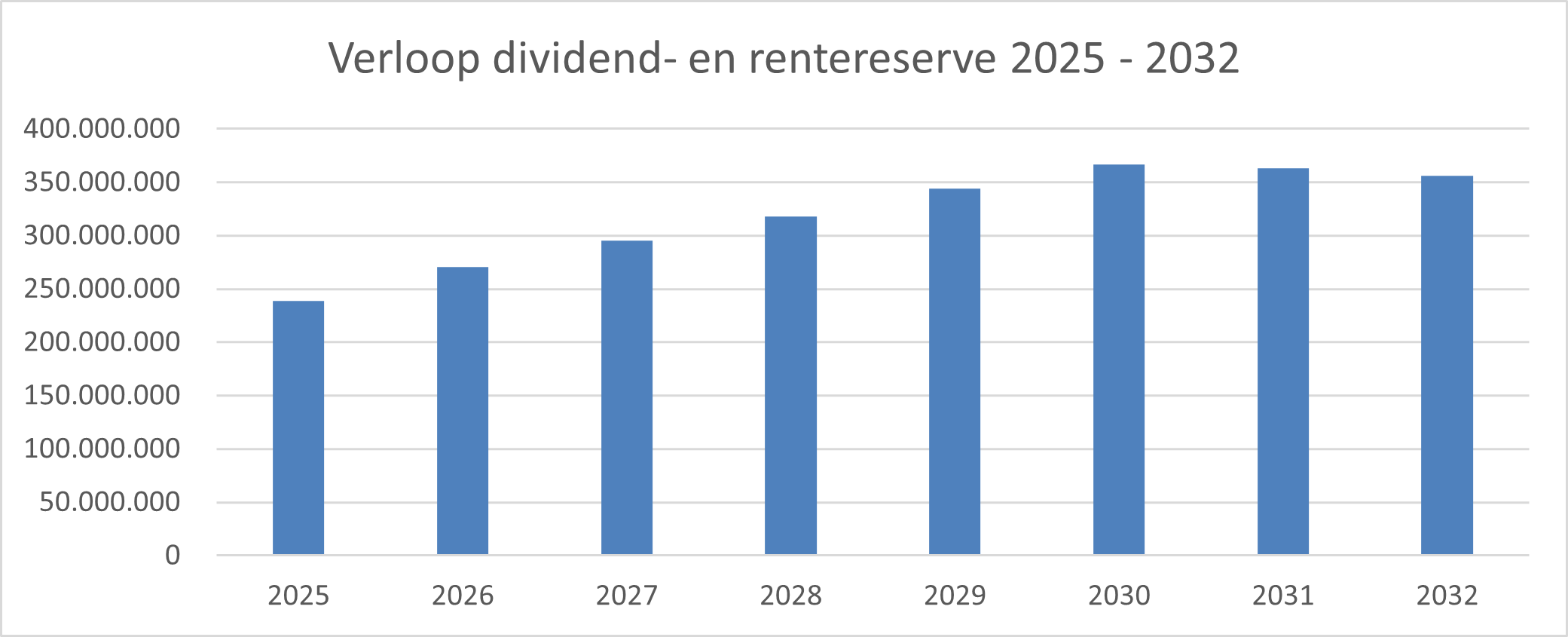 Naast de “buffer” is er binnen de dividend – en rentereserve ook een “egalisatiedeel”. Ieder jaar vinden er “vaste” onttrekkingen plaats. In de periode 2026 tot en met 2028 loopt het egalisatiedeel naar nihil. Het egalisatiedeel bedraagt per ultimo 2025 € 5,8 mln., zodat het totaal van de dividend – en rentreserve ultimo 2025 € 244,6 mln. bedraagt.