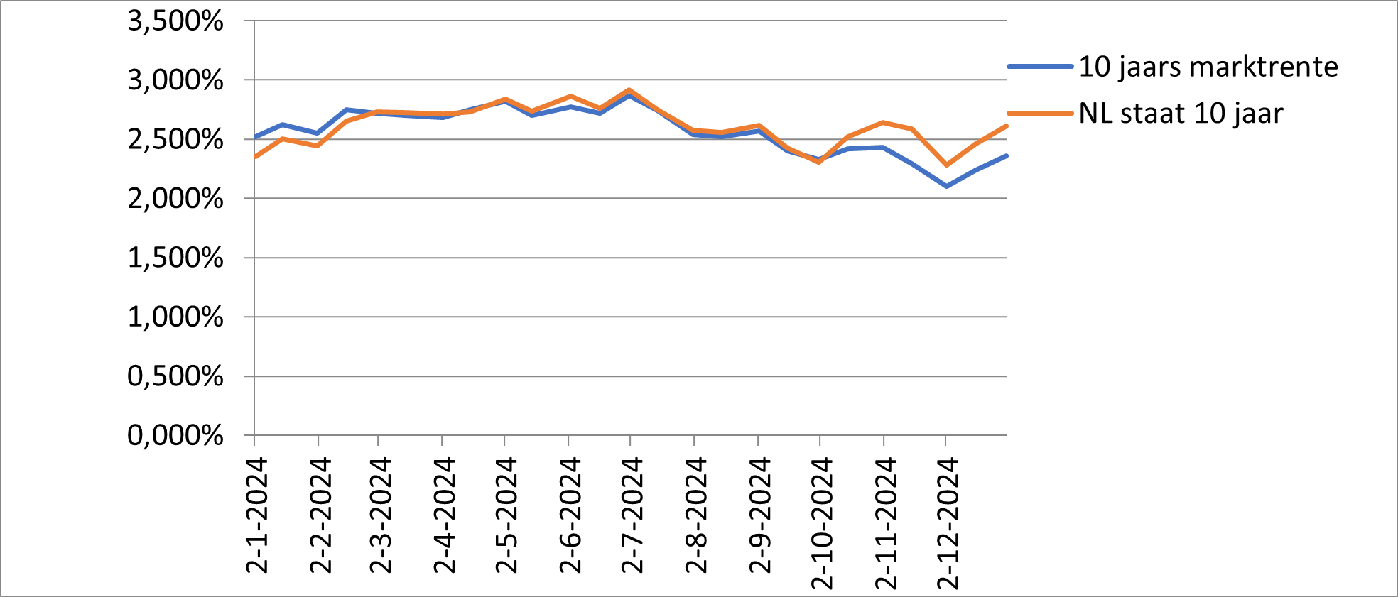 De ingezette stijging in 2021 van de 10–jaarsrente is in 2023 geëindigd. In het laatste kwartaal van 2023 is deze rente gedaald naar ongeveer 2,5%. Gedurende 2024 heeft de rente zich rond dit niveau bewogen, tussen de 2% en 3%. Vanwege de relatief hoge rente in 2024 zijn er 20 leningen verstrekt (2023: 9 leningen) aan decentrale overheden voor een totaalbedrag van € 423,5 mln. en een gemiddeld rendement van 2,94%.