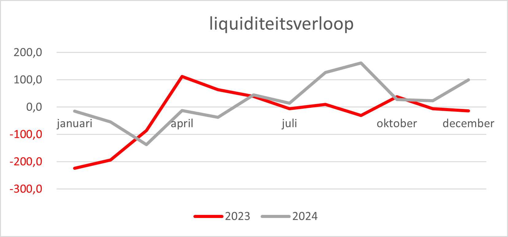 In 2024 is onze liquiditeitspositie met € 247 mln. verbeterd (2023: afname van € 295 mln.). Gepland was in 2024 een daling van € 332 mln. volgens het Jaarplan Treasury 2024. In totaal dus een verschil van € 579 mln. ten opzichte van de prognose (in 2023 was het verschil met de prognose € 275 mln.). Het verschil met de raming in 2024 werd o.a. veroorzaakt door: