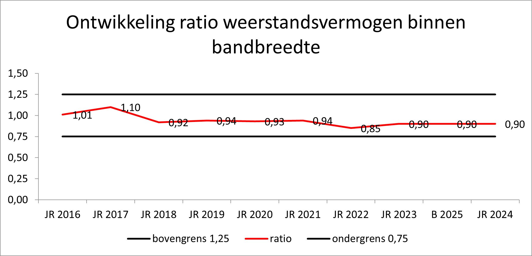 Een stabiel meerjarig beeld van de indicator geeft aan dat risicomanagement zorgvuldig plaatsvindt en tot stand komt volgens een gestructureerd risicomanagementsysteem. Er wordt geen absolute norm gesteld voor de bepaling van de ratio. De bandbreedte voor de ratio weerstandsvermogen als indicator is 0,75 tot 1,25. Het hanteren van een bandbreedte voorkomt dat elk nieuw risico of wijziging in bestaand risico leidt tot het treffen van financiële maatregelen. Onder de 0,75 zijn maatregelen nodig de beschikbare weerstandscapaciteit aan te vullen. Boven de 1,25 kan worden besloten de niet benodigde weerstandscapaciteit terug te laten vloeien naar de algemene middelen. Besluitvorming over het aanvullen of afromen van de beschikbare weerstandscapaciteit vindt plaats bij de integrale afweegmomenten.