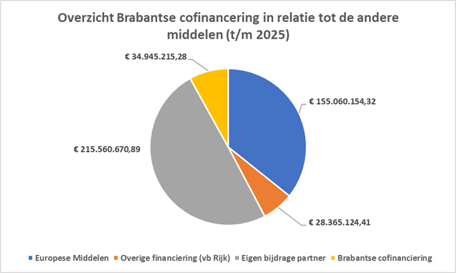 De gerealiseerde cofinanciering op de Europese projecten was € 29.1 mln. per 31-12-2025. Er zijn van de openstellingen tot en met 2025 nog projecten die nog verleend moeten worden. Ook is er in dit bedrag realisatie niet meegenomen i.v.m. provinciale regels met betrekking tot lastneming (beschikkingen die het volgende jaar pas starten en bedragen boven € 2,5 mln.). Hiermee rekening houdend komt de totale Brabantse cofinanciering t/m 2025 op € 34.9 mln. en daarmee wordt ruim € 399 mln. aan middelen derden gegenereerd.