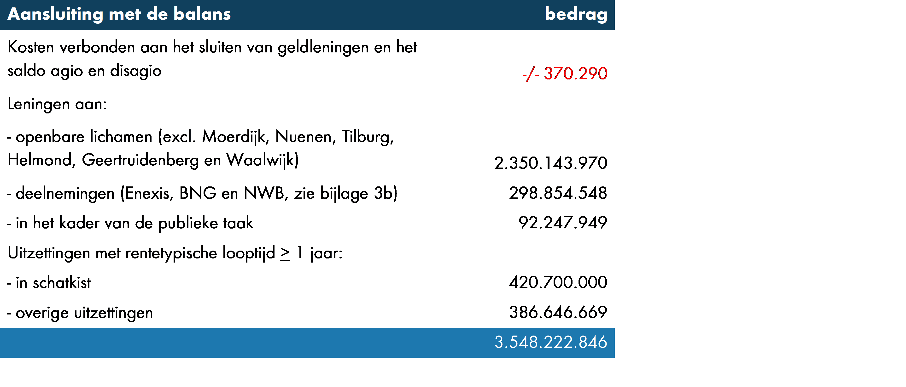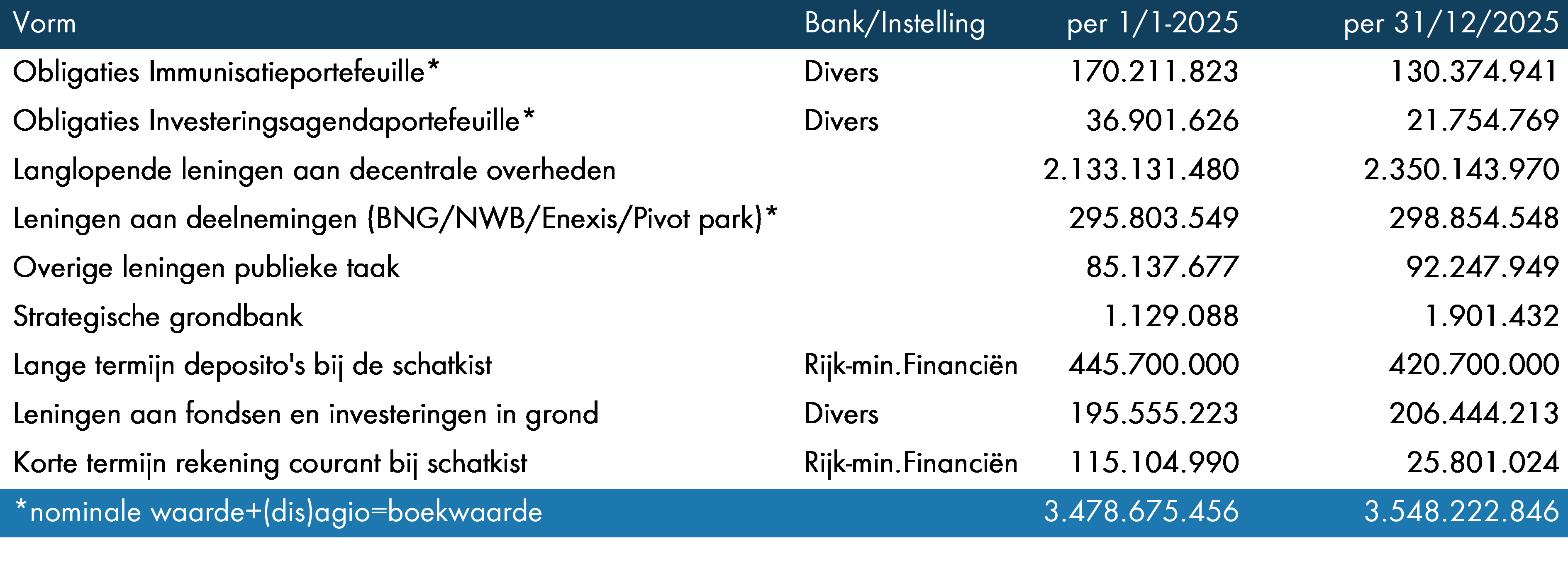 De beleggingen in de beide portefeuilles, inclusief de verstrekte leningen aan openbare lichamen en deposito’s bij de schatkist, bedragen in overeenstemming met de balans € 3.548,2 miljoen (2024: € 3.478,7 miljoen).