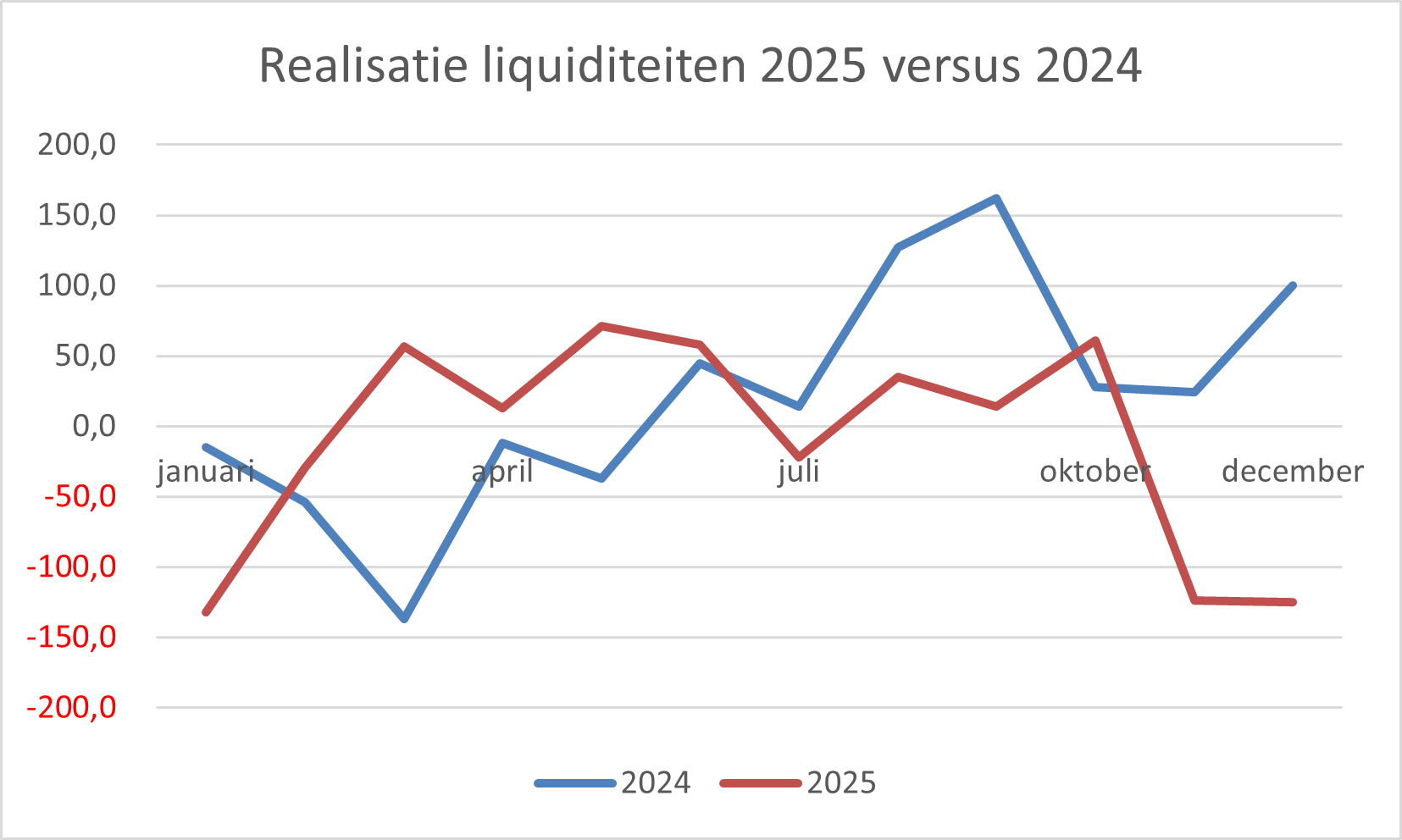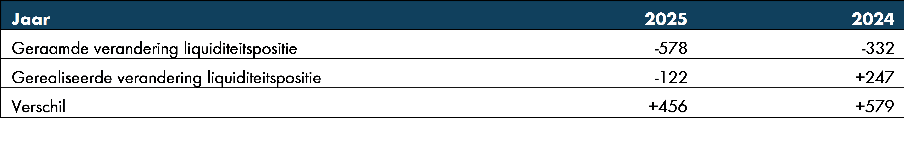 In 2025 is onze liquiditeitspositie met € 122 mln. gedaald (2024: toename van € 247 mln.). Gepland was in 2025 een daling van € 578 mln. volgens het Treasury Jaarplan 2025. In totaal dus een verschil van € 449 mln. ten opzichte van de prognose (in 2024 was het verschil met de prognose € 579 mln.). Het verschil met de raming in 2025 werd o.a. veroorzaakt door:
