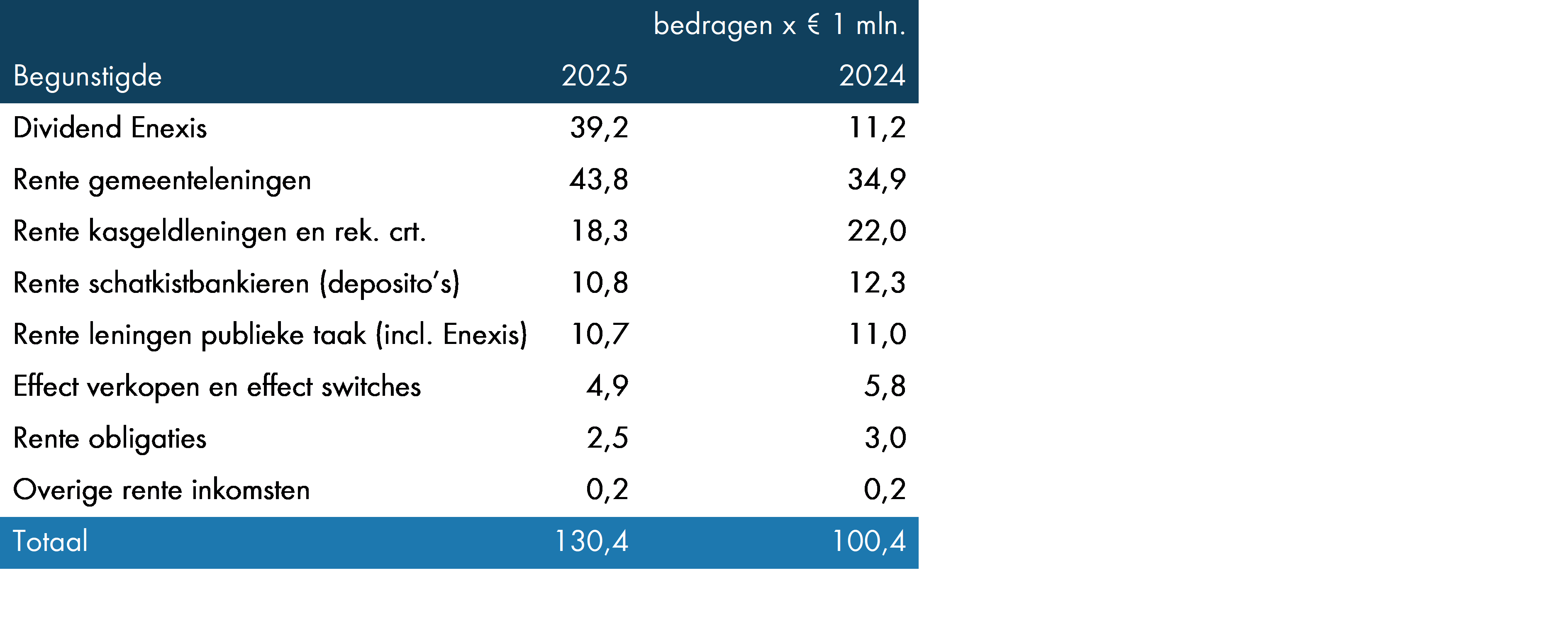Het gerealiseerde rendement over 2025 bedraagt € 130,4 mln. (2024: € 100,4 mln.) en is als volgt opgebouwd (zie ook “algemeen financieel beleid”).