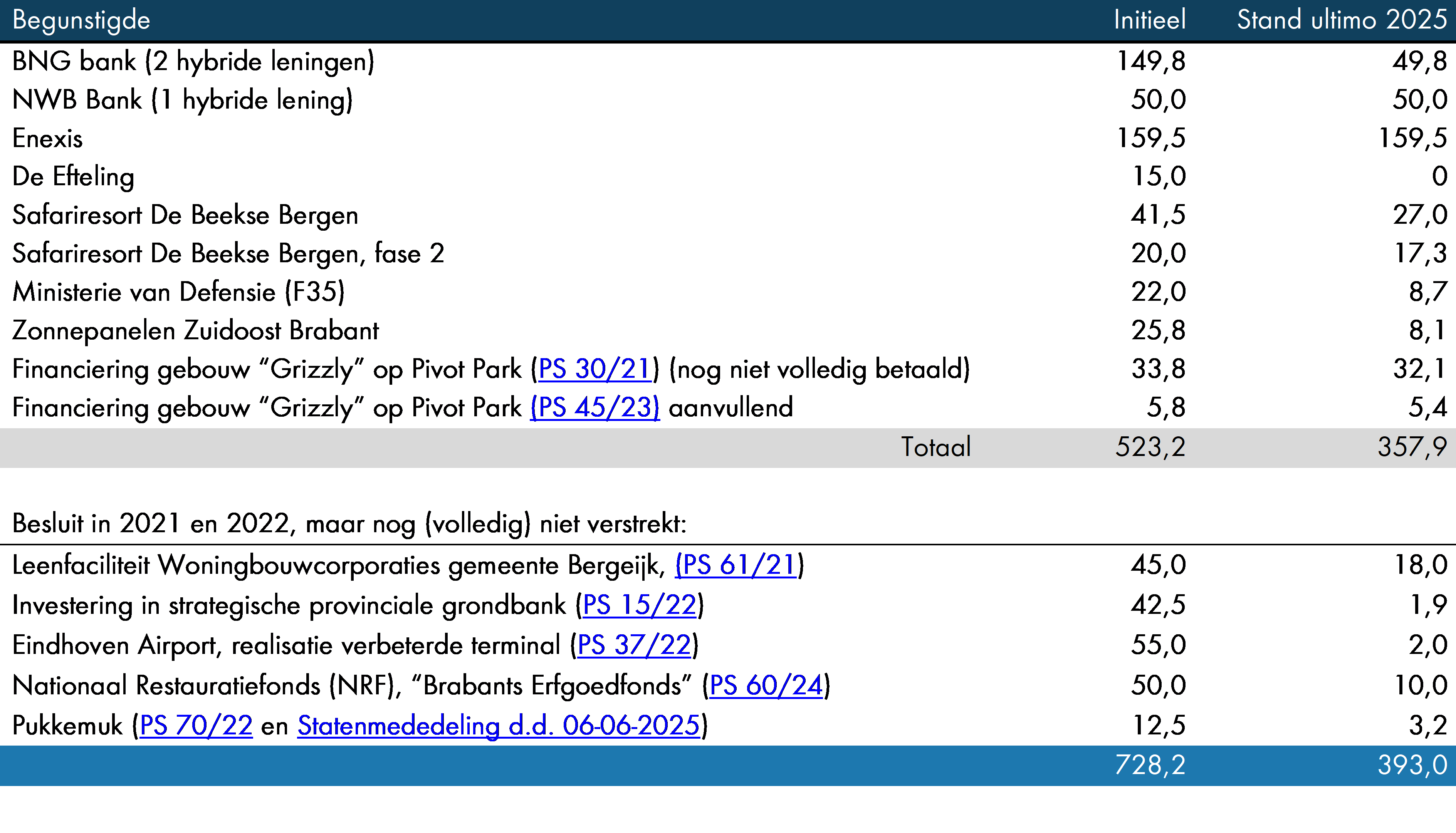 In 2025 is voor € 480,2 mln. aan nieuwe leningen verstrekt (2024: € 461,3 mln.). Dit is inclusief € 408 mln. aan gemeenten en waterschappen en een Havenschap waar de provincie geen toezicht op uitoefent. Na aflossing (€ 219,9 mln.) van de bestaande en de nieuw verstrekte leningen, resteerde er per balansdatum ruim € 3.051 mln. (ultimo 2024: € 2.791 mln.) aan leningen u/g. Dit is exclusief de voorzieningen van € 22,1 mln. die zijn getroffen. Het risico van deze leningen wordt continu gemonitord. Daarnaast is €0,5 mln. afgeboekt als oninbaar in 2025. Voor een specificatie van alle leningen wordt verwezen naar bijlage 3b van het bijlagenboek.